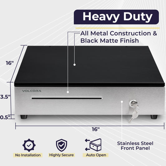 16'' Cash Register Drawer w/ 5 Bill 6 Coin Cash Tray, Auto-open, Black, with Stainless Steel Front