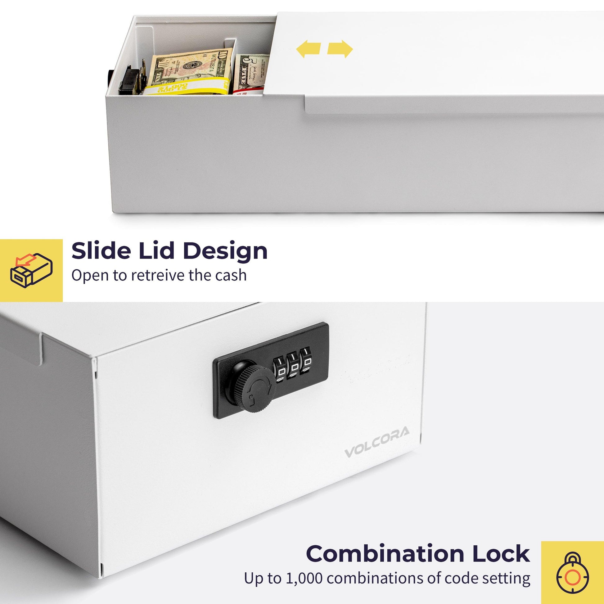 In addition, the cashbox organizer is designed for POS and cash management ecosystem with seamless integration for Volcora POS products. No setup is required, just store your cash and coins securely in the cash box and set the combination lock.