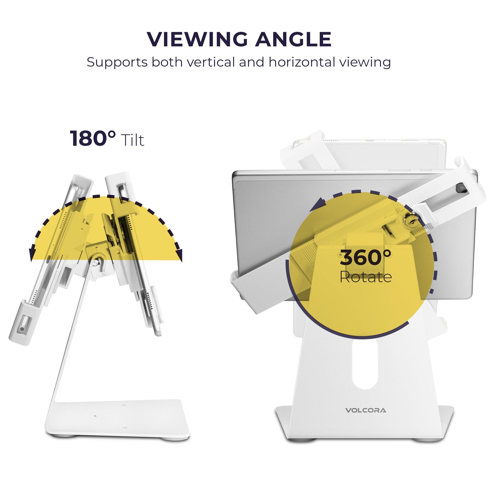 Our iPad and Tablet stand rotates 360 degrees and can tilt 180 degrees in either direction.