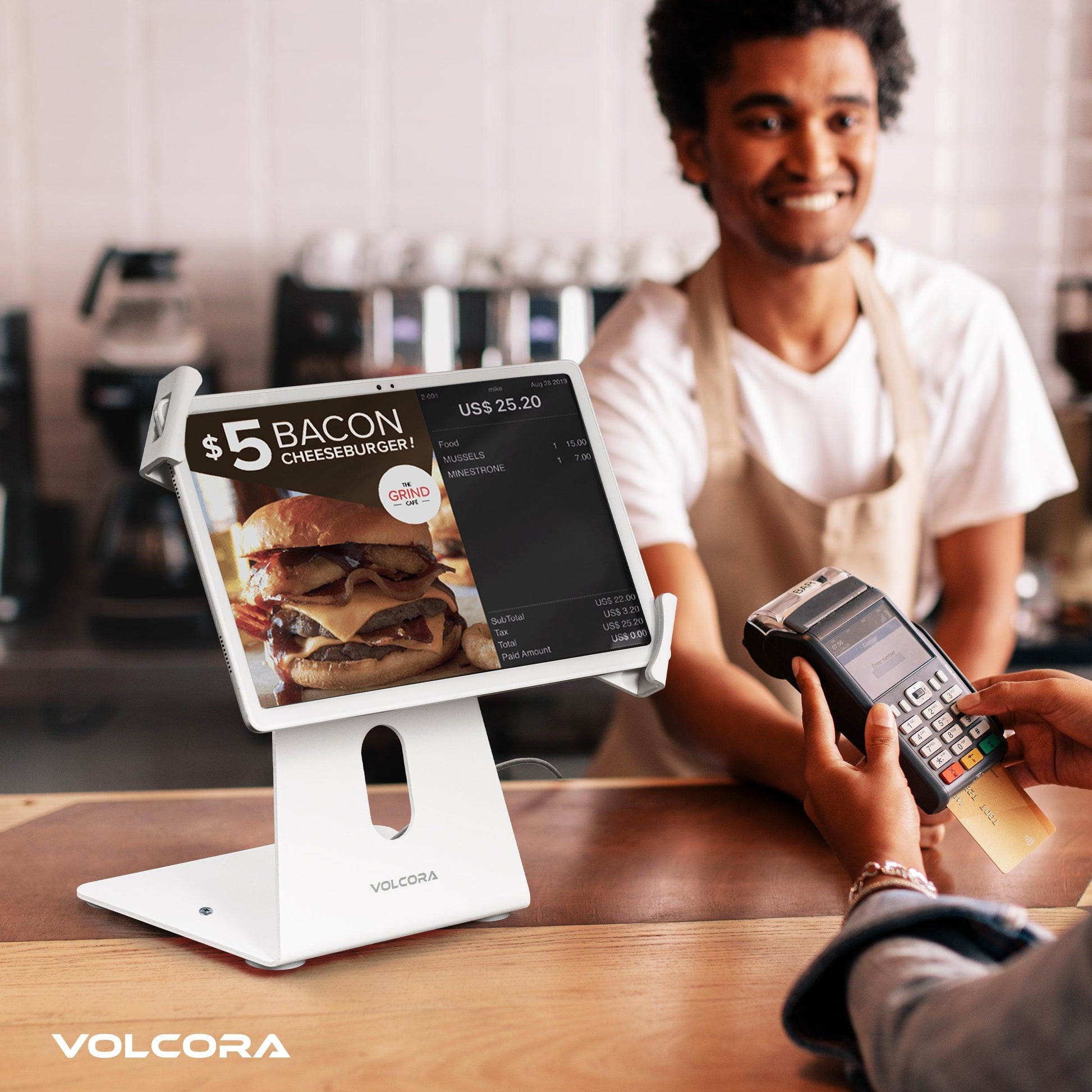The bracket holder can adjust to fit tablets 10 to 13” and the bottom of the stand includes 2 pre drilled holes with screws and securing parts. Our tablet holder stand is perfect to use as a POS kiosk stand for restaurants, retail, cashiers, kiosk stand, information display, and small businesses.
