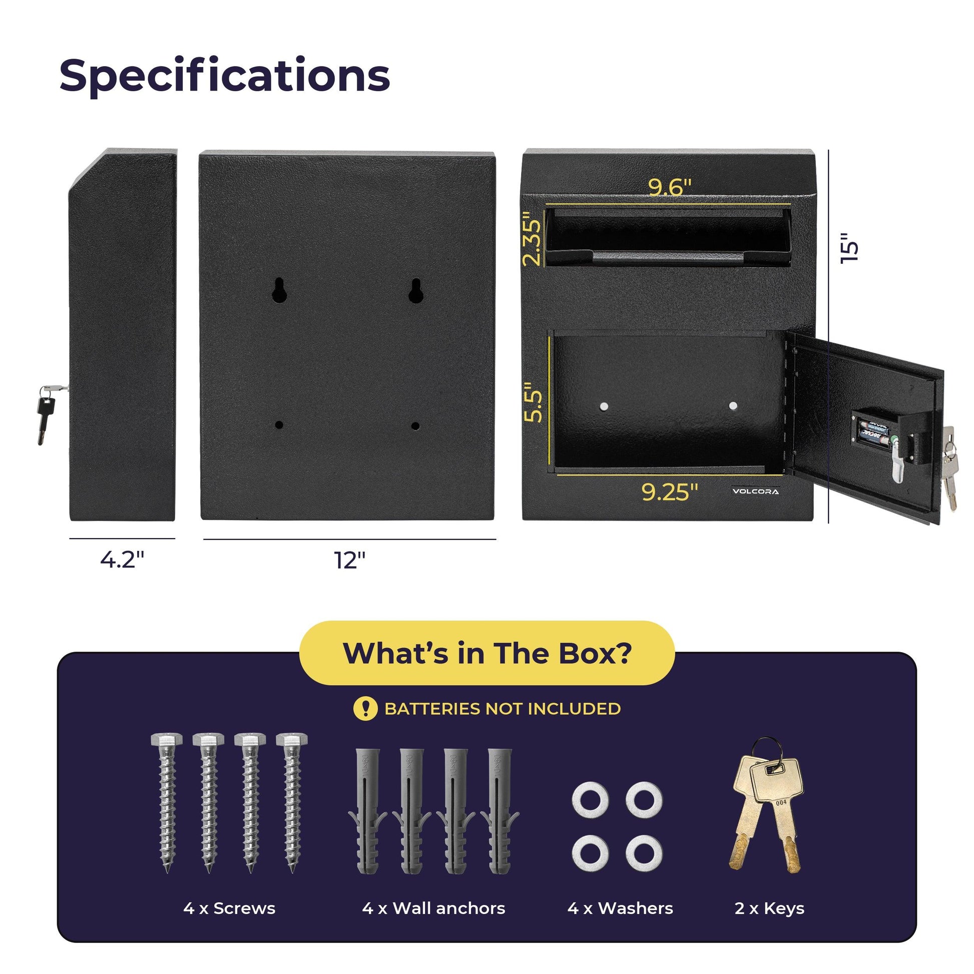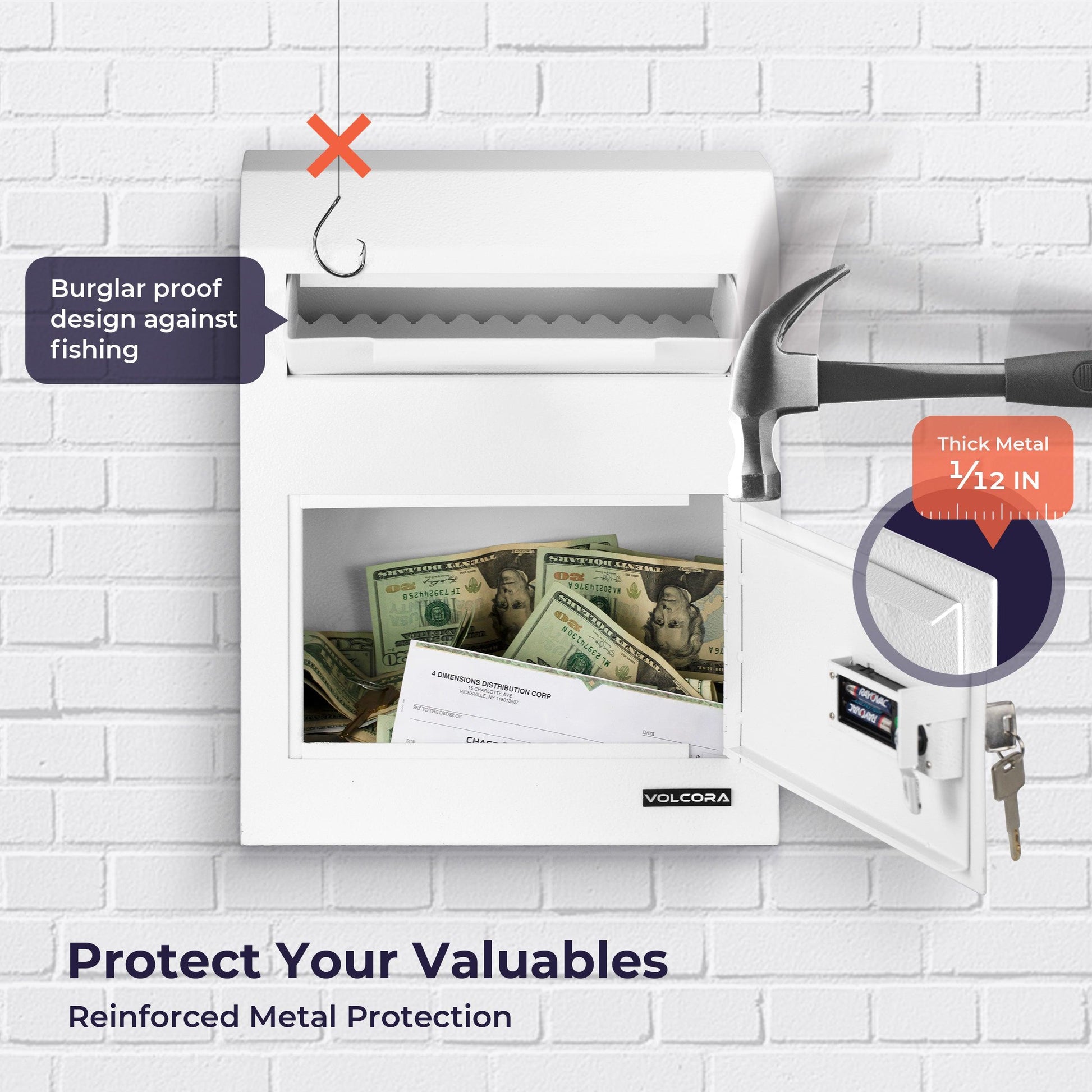 Volcora's wall mount keypad drop safe is perfect for business owners intended for primary mailbox indoor use as a drop box safe for keys, cash, money, payment, checks, documents, and other important things. Our drop safe with locks for business is designed with top-notch security, including a key lock and electronic combination lock with dual lock and unlock capabilities for anti-thief protection and maximum security. Moreover, it is equipped with a safe one-way access hinge door slot to fully protect from thieves and provide maximum security for the durable high-quality cash box with a lock and slot.