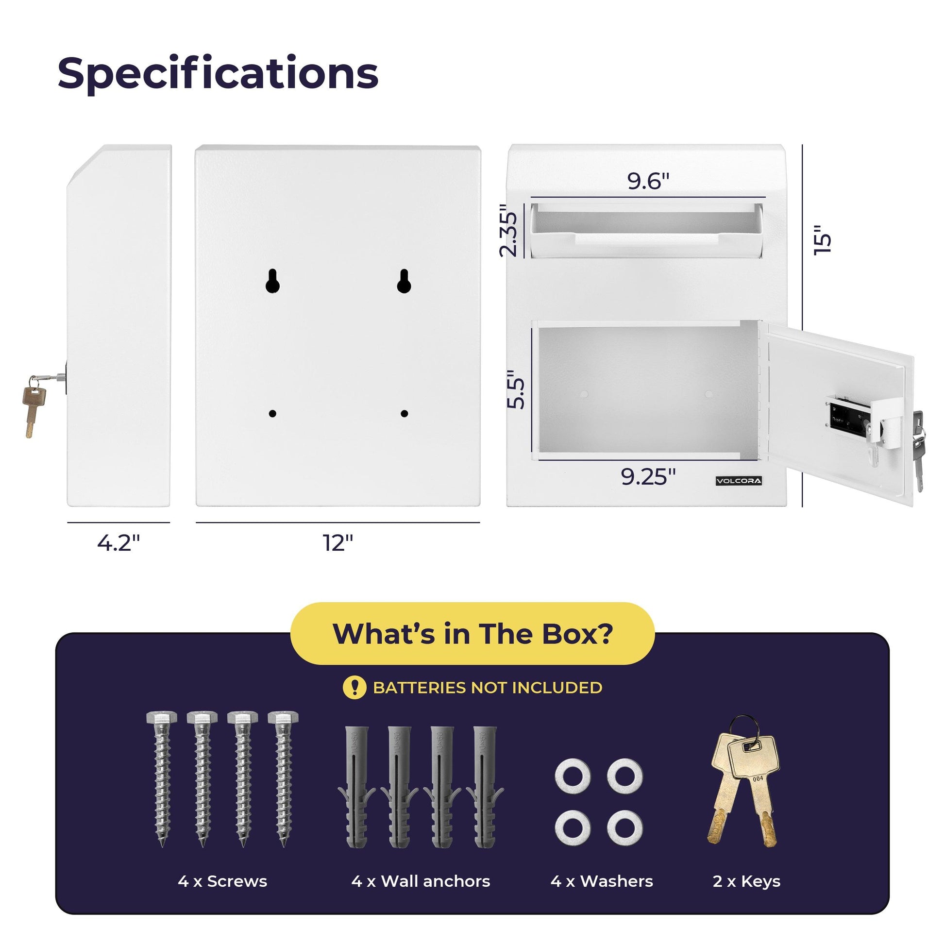 Volcora's Drop Safe provides two colors of black and white to choose from and offers a perfect dimension of a large size with 15" x 12" x 4" for multi-functional uses such as cash drops for supermarkets, key drops for car rental businesses, or house rental, check or envelope deposit drops for retail, document drops for law offices, comment drops for government, ballot drops for election, or a variety of other purposes. Meanwhile, it can be conveniently wall-mounted with pre-drilled holes, mounting screws, and simple instructions to mount in diverse locations that work great for industries including leasing businesses, offices, governments, retail and hospitality, schools, churches, community centers, and even household use.